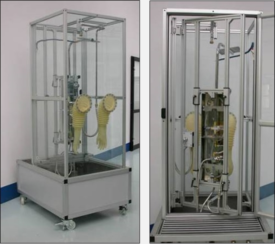 Structural frame made by high-tensile aluminium profiles and side panel glass made, stainless steel internal tank with recovery pump, assembly on rotating wheels provided with parking brakes.